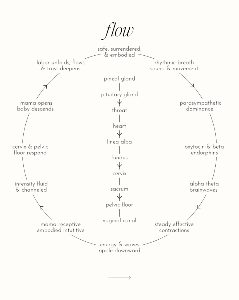 The flow-surrender-pleasure cycle supports a smooth and possibly euphoric and embodied experience for mama, keeps baby oxygenated and safe, and reduces the risk of interventions, unwanted outcomes and birth trauma.